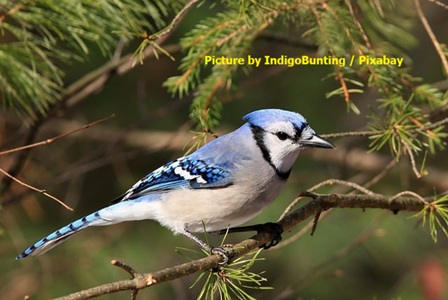 The image shows a vibrant Blue Jay (Cyanocitta cristata) perched on a thin tree branch surrounded by green pine needles.The bird is in profile, facing right, with its distinctive bright blue crest raised, blue upperparts, wings, and long tail featuring black bars and white tips. Its underparts are pale grayish-white, with a black collar extending around the neck and a white face. The beak is sharp, pointed, and black, and the dark eye stands out against the lighter face.The background is a soft, blurred green bokeh from evergreen foliage, suggesting a natural woodland or forest setting. The overall lighting is natural and even, highlighting the bird’s striking blue plumage.A small credit text in the upper right corner reads: “Picture by IndigoBunting / Pixabay”.
