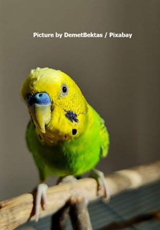 The image shows a close-up of a vibrant Budgerigar (commonly known as a budgie or parakeet) perched on a natural wooden branch. The bird has: Bright yellow head and face. A blue cere (the area above the beak) with nostrils visible Distinct black scalloped markings on the cheeks and throat. Vivid green body and wings. Dark eyes with a alert, curious expression as it looks slightly to the side. The background is softly blurred with warm, neutral tones, keeping the focus entirely on the bird. The lighting is natural and gentle, highlighting the bird’s colorful plumage. The overall mood of the image is calm and endearing. Credit in the image reads: “Picture by DemetBektas / Pixabay”