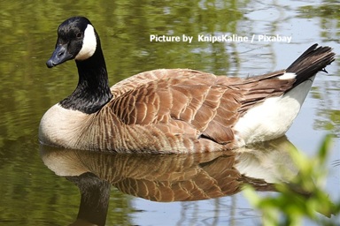 The image shows a Canada Goose (Branta canadensis) swimming calmly on a body of still water, likely a pond or lake. The goose is captured in a classic side profile, facing left, with its reflection clearly visible in the glassy surface below, creating a symmetrical and serene composition. Key features of the goose: Distinctive black head and neck with a prominent white “chin strap” patch running from the throat up the sides of the face. Long, elegant black neck. Brownish-gray body with lighter brown flanks and a white underbelly. White rump patch visible at the tail. Black tail feathers. The background is softly blurred with green foliage, suggesting a natural wetland or park setting in spring or summer. The lighting is natural and even, highlighting the goose’s plumage details and the mirror-like water reflection. The overall mood of the photograph is peaceful and tranquil.The image is credited to “KnipsKaline / Pixabay” in the upper right corner.