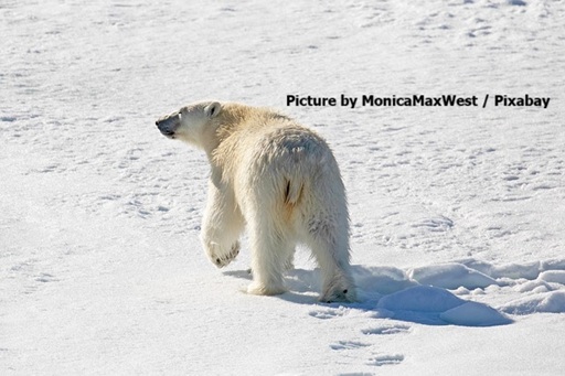 The image depicts a solitary Polar Bear walking away from the viewer across a vast, snowy landscape. The bear is captured from behind, with its head slightly turned to the left, revealing a glimpse of its profile. Its thick white fur blends seamlessly with the surrounding snow, which appears pristine and gently undulating under bright, clear sunlight. Footprints trail behind the bear in the snow, emphasizing its movement. The overall scene evokes a sense of isolation and the harsh beauty of an Arctic environment. The photo is credited to MonicaMaxWest on Pixabay.