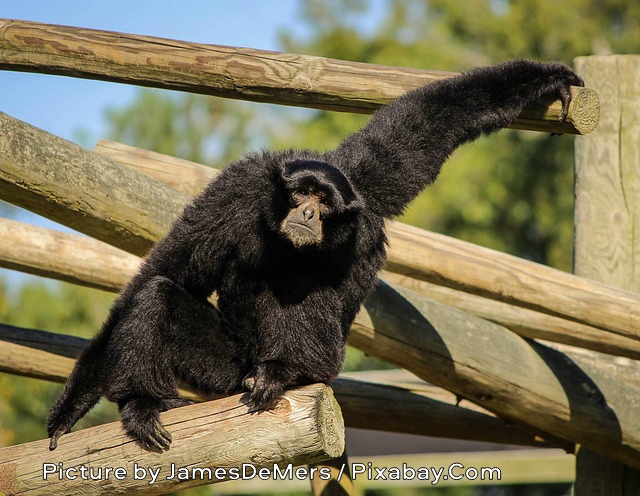 The picture captures a striking Siamang (Symphalangus syndactylus) perched casually on a sturdy wooden beam in what appears to be a zoo enclosure. This large black ape sits in a relaxed yet … Continue