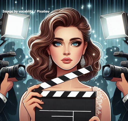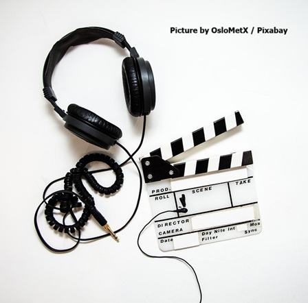 This image is a stock photograph from Pixabay, credited to OsloMetX. It features a pair of black over-ear headphones with a coiled cable ending in a 1/4-inch jack plug, positioned on the left side. To the right is a classic film clapperboard (also known as a slate) with black-and-white diagonal stripes on the hinged clapstick at the top. The clapperboard’s board section includes labeled fields for production details such as “PROD.,” “ROLL,” “SCENE,” “TAKE,” “DIRECTOR,” “CAMERA,” and additional checkboxes or notes for “Day Nite,” “Int Sync,” and “Filter.” Both items are laid flat on a plain white background, suggesting a … Continue